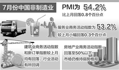 国家统计局服务业调查中心、中国物流与采购联合会8月3日发布的非制造业商务活动指数(PMI)显示,7月中国非制造业PMI为54.2%,虽比上月回落0.8个百分点,但仍高于荣枯线4.2个百分点。