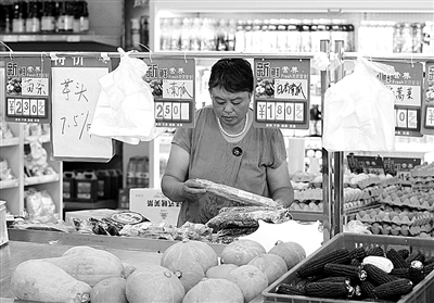 8月3日,市民在江苏南通一家平价农产品直营店选购蔬菜。店内销售的蔬菜以基地直供为主,物流补货为辅,保证菜品新鲜。据了解,直营店的蔬菜平均价格比农贸市场低10%至20%,个别品种甚至低40%以上。截至2014年8月,南通市区设立的直营店已达12家。 新华社记者 许丛军摄