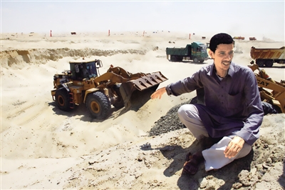 右图 在埃及首都开罗北部的港口城市伊斯梅利亚,一名工人在新运河工程附近休息。
