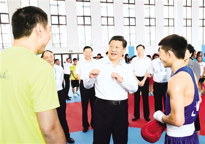 习近平还看望了田径、柔道、拳击运动员,400米跨栏运动员徐志航、柔道运动员刘晓雨、拳击运动员吕平分别向习近平介绍了训练情况和比赛用具、比赛规则,习近平希望他们刻苦训练,不断提高自己的综合素质和能力,争取好的成绩。习近平对拳击运动员吕平说,拳击是一个勇敢者的项目,攻守要全面,速度、力量、抗打击能力、反应、体能要全面发展,要有过硬的心理素质和意志品质。