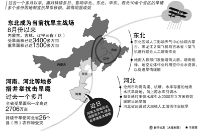 农业部副部长余欣荣说,目前农业抗旱的重点正转向东北地区。近一个多月来,内蒙古、辽宁、吉林3省区降雨较常年偏少3至7成,局部地区旱情发展较快。截至8月12日,内蒙古、辽宁、吉林3省区受旱面积达到3400多万亩,其中严重受旱面积1500多万亩。