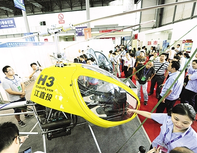 8月15日,参观者在现场观看直升机。当日,第四届中国智能博览会在江西南昌市国际展览中心开幕。智能仿生机器鱼、生物CAD/CAM/3D打印机、智能互联网机器人等一大批国际国内领先智能技术亮相。