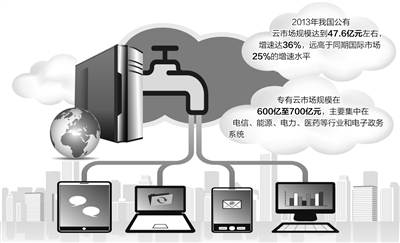 据专业机构统计,2012年我国公有云市场规模达35亿元左右,2013年达到了47.6亿元左右,增速达36%,远高于同期国际市场25%的增速水平;专有云市场规模在600亿至700亿元左右,主要集中在电信、能源、电力、医药等行业的大型企业及部分发达地区的电子政务系统。