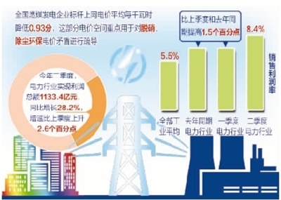 根据中经电力产业景气指数监测,今年二季度,经初步季节调整,电力行业实现利润总额1133.4亿元,同比增长28.2%,增速比上季度上升2.6个百分点,连续2个季度保持上行。经测算,电力行业销售利润率为8.4%,比上季度提高1.5个百分点,比去年同期提高1.5个百分点,是近几年来的最高水平,明显高于全部工业销售利润率5.5%的平均水平。