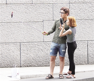 近日,一款相机伸缩杆风靡韩国首尔街头。这种自拍杆能够在20厘米到120厘米长度间任意伸缩,使用者只需将手机或者傻瓜相机固定在伸缩杆上,通过遥控器就能实现多角度自拍。这种自拍杆的价格一般在1万至5万韩元之间(约合人民币60至300元)。图为一对情侣在韩国首尔街头自拍。 (新华社发)
