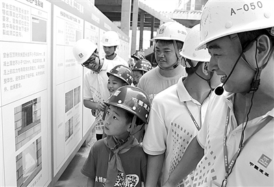 湖南长沙北辰三角洲项目工区日前举行关爱农民工子女“带孩子上班日”主题活动。活动邀请建筑工人子女来到施工现场,和父母一起工作生活并亲身体验父母工作的艰辛。图为小朋友们在施工现场参观学习,体验父母一天的工作生活。