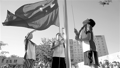 9月3日上午,北京东城区培新小学,同学们参加“升国旗、唱国歌、向国旗敬礼”活动。为培育和践行社会主义核心价值观,培养广大中小学生热爱党热爱社会主义的朴素感情,北京团市委、市委教育工委、市教委、市政府教育督导室、市少工委于2014年9月开学时,在全市中小学全面启动每日“升国旗、唱国歌、向国旗敬礼”活动。