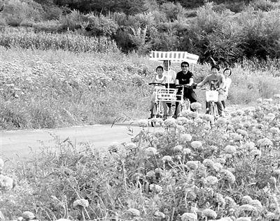 北京延庆县四海镇大力建设“四季花海”创意农业示范区,实现花卉种植、花卉加工、休闲旅游的产业融合。2014年,花卉产业综合收入3700万元。图为游人在延庆县的四季花海景观园区内骑车游玩。