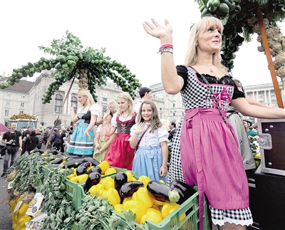 2014年维也纳丰收节近日在奥地利首都维也纳举行。丰收节原是农民在秋收后为表达感恩之情而举行的庆祝活动。随着时间的推移,这个节日已演变为一个农产品展示、交易和分享的节日。图为一辆满载果蔬的花车行进在游行队伍中。 (新华社发)