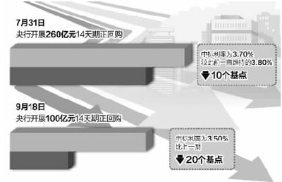 9月18日,中国人民银行开展100亿元14天期正回购操作,中标利率为3.50%,比上一期下调20个基点。这是该利率年内第二次下调。7月底央行曾将中标利率从3.8%降至3.7%。分析认为,央行下调中标利率,释放引导市场利率下行、降低融资成本的政策信号,近期降息降准的概率下降。