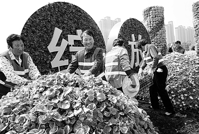 9月19日,工作人员在山东省济南市街头摆放景观花坛。据介绍,今年的花坛多数沿用了曾经使用过的旧骨架和喷灌设施,做到了重复使用。