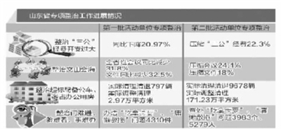 山东各地各部门坚持边学边改、边查边改、立行立改,着力解决群众反映强烈的突出问题和发生在群众身边的不正之风,以整改的实际行动赢得群众信任和支持。在第一批活动单位专项整治中,山东省取消和下放行政审批事项262项,受理“吃拿卡要”、“庸懒散拖”问题4429件,办结4310件;第二批专项整治中,山东省取消和下放行政审批事项6369项,查处在项目审批、专项转移支付资金分配等工作中搞暗箱操作、权力寻租问题78起、53人。