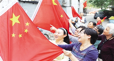 | 9月29日,北京西城区先农坛社区,居民们悬挂国旗,同庆共和国生日。 |
