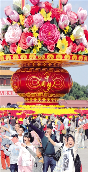 | 国庆前夕,天安门广场花团锦簇,洋溢着喜庆祥和的节日气氛。来自江西的游客在天安门广场“祝福祖国”大花篮前合影。 |