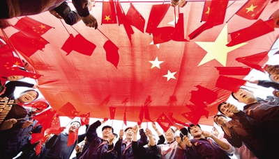 | 9月29日,河北112国道施工现场,建设者们挥舞国旗,高唱歌曲,祝福祖国。 |