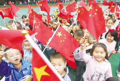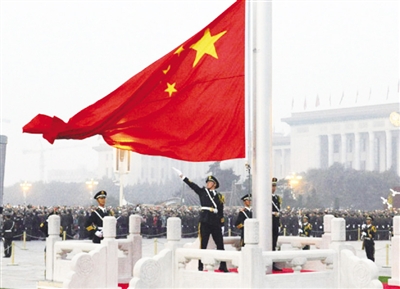 又到了升起国旗的时刻,迎着共和国华诞的曙光,武警北京总队天安门支队国旗护卫队上士升旗手高红甫再一次站在国旗杆下,凝神屏息。伴随着熟悉的《义勇军进行曲》,他握着国旗一角的右臂分毫不差地高扬,划出一道坚强有力的弧线。17平方米的国旗被撒成一个扇形,朝着他挥臂的方向,撒向共和国。