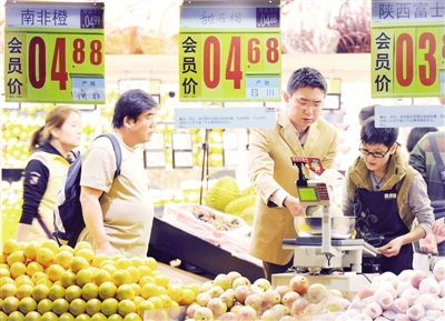 上图 10月2日,顾客正在北京市一水果超市购买水果。国庆假日,北京市各大超市、水果市场,货源充足,百姓消费成主角。本报记者 李景录摄