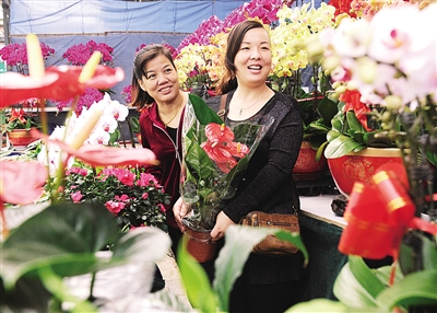 左图 10月3日,市民在北京玉泉营花卉市场选购花木,装扮家居。国庆假日期间,平价花卉销售火爆。本报记者 李树贵摄