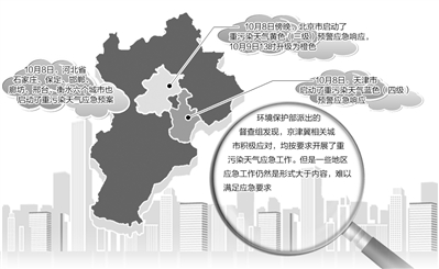 10月8日傍晚,北京市启动了重污染天气黄色(三级)预警应急响应,10月9日13时预警级别由黄色升级为橙色;10月8日,天津市启动了重污染天气蓝色(四级)预警应急响应;10月8日,河北省石家庄、保定、邯郸、廊坊、邢台、衡水6个城市也及时启动了重污染天气应急预案。
