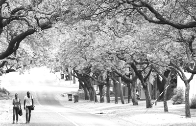 “彩虹之国”南非大量种植着一种名为“蓝花楹”的树,属于紫葳科落叶乔木。因为它的花朵是蓝紫色,生活在南非的中国人通常把它叫作“紫薇花”。每年10月,种植有8万多株紫薇花的南非行政首都比勒陀利亚都会因为紫薇花绽放成为一片紫色的海洋,吸引大量游客前来观赏拍照。比勒陀利亚也因此获得了“蓝花楹之城”的美誉。图为行人从紫薇花树下走过。