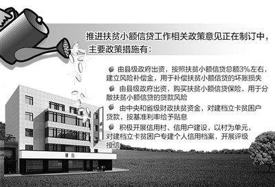记者从国务院扶贫办获悉,推进扶贫小额信贷工作的相关政策意见正在加紧制订中。主要政策措施有四点:由县级政府出资,按照扶贫小额信贷总额3%左右,建立风险补偿金,用于补偿扶贫小额信贷的坏账损失;由县级政府出资,购买扶贫小额信贷保险,成本控制在1%以内,用于分散扶贫小额信贷的贷款风险;由中央和省级财政扶贫资金,对建档立卡贫困户贷款,按基准利率给予贴息;积极开展信用村、信用户建设,以村为单元,对建档立卡贫困户专建个人信用档案,开展评级授信。