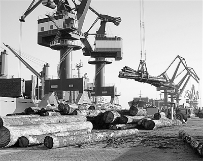 大连长兴岛港日前在其0号泊位成功接卸首艘停靠进口原木船“海洋和谐”号,拉开该港接卸原木进口序幕。据悉,长兴岛港将迎接国家质检总局正式验收,并将成为全国第三个、东北地区惟一的进口木材陆上处理口岸。图为长兴岛港对“海洋和谐”号进行接卸作业。