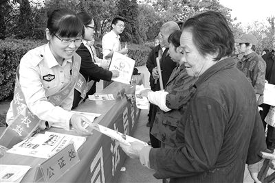 上图 11月1日,山东省阳信县法律援助中心的志愿者们正向老年人宣传法律援助知识。 林世军摄