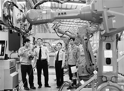 今年以来,浙江省国税局加大政策宣传,引导企业加大技改投入,积极落实增值税转型升级政策,推动全省“机器换人”走上快车道。图为南浔区国家税务局工作人员在某电梯企业了解全国首台ABB机器人投入运行情况。杨建琴摄