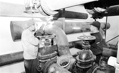 图为内蒙古集宁热力公司的工人们正在维护供热管网。