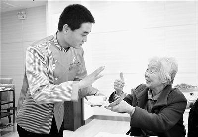 12月3日,兰州市城关区一家火锅店内,一位顾客用手势向聋哑服务员表示感谢。当日是国际残疾人日,位于兰州市城关区西关十字的一家火锅店正式开业。这家火锅店共聘用30多位残疾人在店内工作。