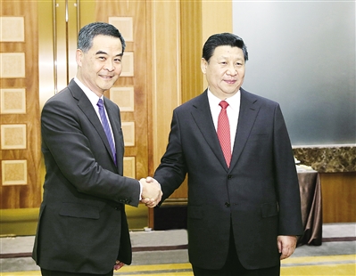 习近平表示,这一段时间以来,你和特别行政区政府以及警队恪尽职守、勇于担当,使得香港当前形势有所好转,中央对你和特别行政区政府是充分信任和高度肯定的。香港特别行政区政制发展必须符合香港实际,必须遵循“一国两制”方针和香港特别行政区基本法,希望特别行政区政府继续依法妥善处理香港政制发展问题。中央将一如既往支持你和特别行政区政府工作。