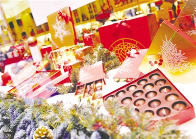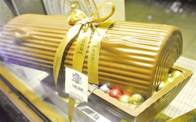在圣诞节来临之际,“巧克力王国”比利时街头的巧克力店纷纷推出圣诞主题巧克力,令圣诞洋溢着香醇甜蜜的味道。图为在比利时布鲁塞尔Leonidas巧克力店拍摄的“重磅”圣诞巧克力,连“木桩”盒子都由巧克力制作。 新华社发