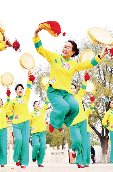 2014年12月31日,河北赵县永通桥公园,扇鼓爱好者彩排节目喜迎新年。