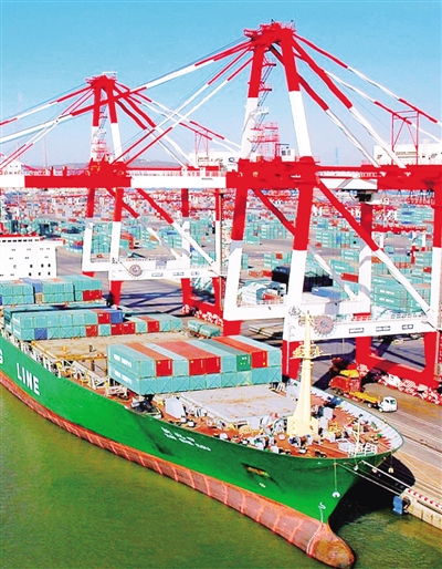 2014年12月31日,辽宁营口港繁忙的集装箱作业码头。2014年营口港全年集装箱吞吐量达到561万标准箱,同比增长5.8%,内贸班轮航线覆盖全国沿海主要港口。