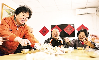 2014年12月31日,北京西城区白纸坊街道养老管理服务中心,老人们欢聚一堂,喜迎新年。目前北京市已建起1万多家社区居家养老服务机构,提供110项服务。