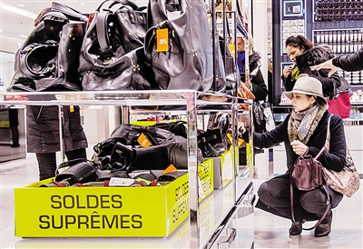 今年1月7日至2月17日的法国冬季打折季正式鸣锣。本届打折季比往年延长一周,为期42天。图为顾客在巴黎春天百货商场购买打折商品。新华社发