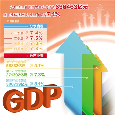 本报北京1月20日讯 记者林火灿 张双报道:国家统计局今天发布了2014国民经济运行成绩单。数据显示,2014年,我国国内生产总值为636463亿元,跨越60万亿元关口,按可比价格计算,比上年增长7.4%,实现了去年年初确定的“GDP增长7.5%左右”的预期目标。国民经济在新常态下保持平稳运行,呈现出增长平稳、结构优化、质量提升、民生改善的良好态势。
