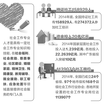 民政部社会工作司司长王金华介绍,2014年,我国参加社会工作者职业水平考试人数首次突破20万。截至2014年底,全国持证上岗的社会工作者(助理社会工作师和社会工作师)已达15.9万人,比2013年增长29.1%。各方面社会工作专业人才数量突破40万人。