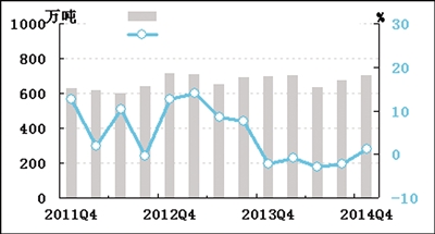 经初步季节调整③,2014年四季度乳制品产量为705.2万吨,由上季度同比下降2.2%转为增长1.3%。国内乳企大量进口奶粉进行还原生产,使2013年下半年以来的原奶供给短缺现象发生了转变,乳制品生产目前摆脱了上游原料不足的制约。