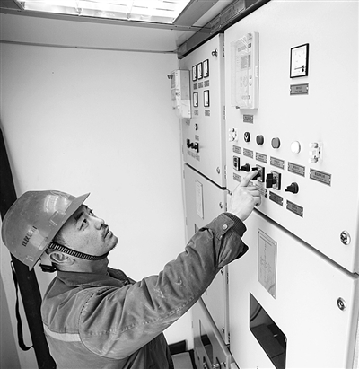 实现“油改电”低碳页岩气钻井模式的焦页57号钻井平台电气系统控制室内,一名中石化江汉油田钻井队的技术员在操作配电设备,为钻井提供清洁的电能。中石化江汉油田涪陵页岩气公司通过积极推进电能替代柴油这种“油改电”低碳页岩气钻井模式,2014年涪陵页岩气开发的钻井平台减少柴油消耗约12000吨,降低了10%以上的能耗。