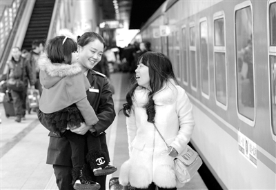 上图 2月4日,从北京西开往龙岩的“红古田号”K571次列车乘务员为旅客提供服务。 本报记者 赵 晶摄