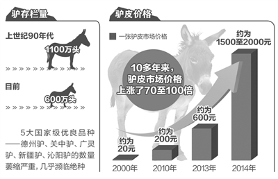毛驴的存栏量锐减,让驴皮价格一路飙升。作为全国阿胶生产重镇,山东聊城市的主管部门则感受到了更大的压力。据聊城市畜牧兽医局局长王鲁透露,当地阿胶企业每年的产能需要400多万张驴皮,现在仅能满足四分之一。