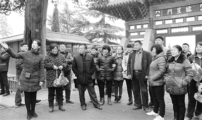 2月21日,山东省济宁市邹城市“两孟”景区讲解员孟醒(左三)为前来景区参观的游客进行讲解。