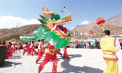| 2月19日,云南昭通市鲁甸县龙头山镇地震灾区灰街子安置点,村民舞起龙灯闹新春。 |