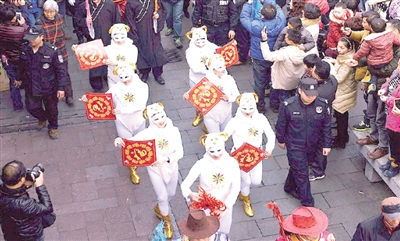 | 2月19日,浙江杭州河坊街举行“喜气洋洋拜大年”活动,为游客及沿街商户送上新春祝福。 |
