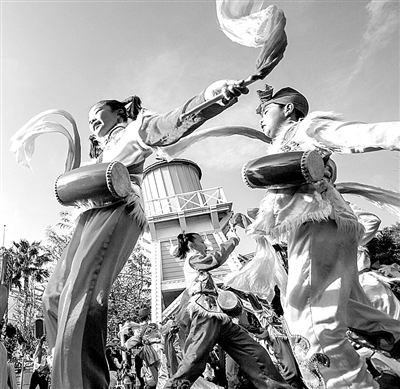 春节期间,陕北风情少年艺术团在美国加州迪斯尼冒险乐园表演陕北风情舞蹈安塞腰鼓和洛川秧歌,吸引了大量游客观看。 赵汉荣摄(新华社发)