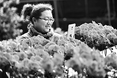 试水微店成效不错的子非花园也积极带动其他花农上网销售,目前该花卉基地已经有百余户花农开启了花卉的电商销售。图为尹艳玲正在拍摄用蝴蝶兰组成的花卉景观,准备放到微店上销售。