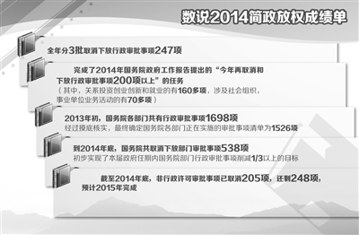 2月27日,在国务院政策例行吹风会上,国务院审改办负责人吴知论表示,2014年全年分3批取消下放行政审批事项247项,完成了2014年国务院政府工作报告提出的“今年再取消和下放行政审批事项200项以上”的任务。其中,关系投资创业创新和就业的有160多项,涉及社会组织、事业单位业务活动有70多项。