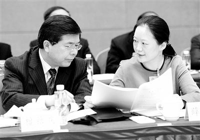 三月五日下午,全国人大安徽代表团审议政府工作报告,薛颖代表(右)和檀结庆代表就相关内容进行交流。
