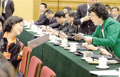人大江苏团王芳代表(左)与同团余瑞玉代表(右)就即将提交的建议相互交流。